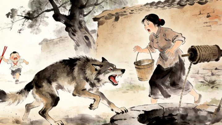 遭此奇遇,饿狼无法,只得再次向地盘爷诉求。地盘老儿又掐指一算说:来日午时,她要出来汲水,已经一劫,你去吃吧。饿狼兴冲冲来到井边等候。