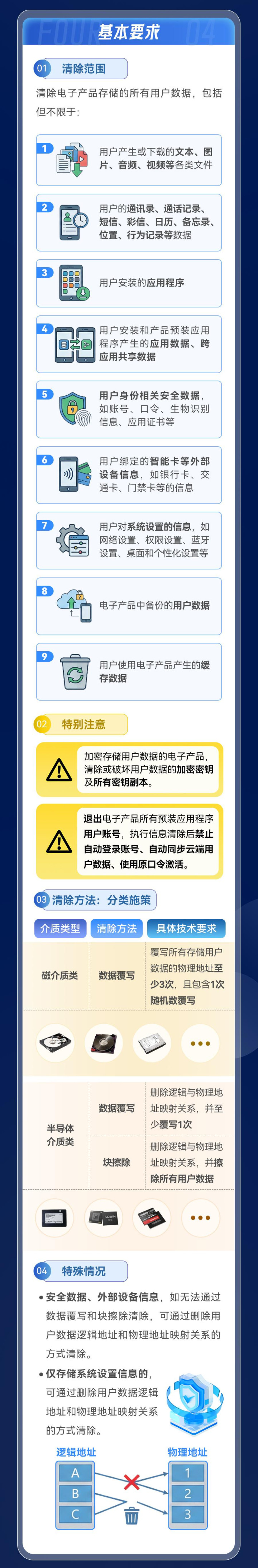 这项强制性国度尺度的适用鸿沟涵盖了在我国境内出产、销售的各种具有非易失性存储介质的电子居品,包括手机、平板电脑、条记本电脑、台式计较机,以及智能一稔设备、办公设备等。其照顾对象既包括电子居品制造商、工夫就业提供方,也包括二手电子居品回收蓄意者。
