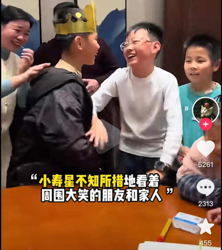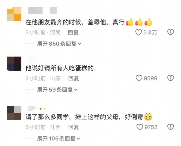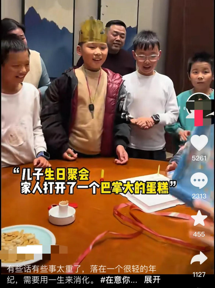 “他的同学们也尴尬,愣了一下但照旧助威。过诞辰的小孩挂脸了,他们这个阶段的孩子抒发不准确情谊。可能成年后会成为午夜恶梦”