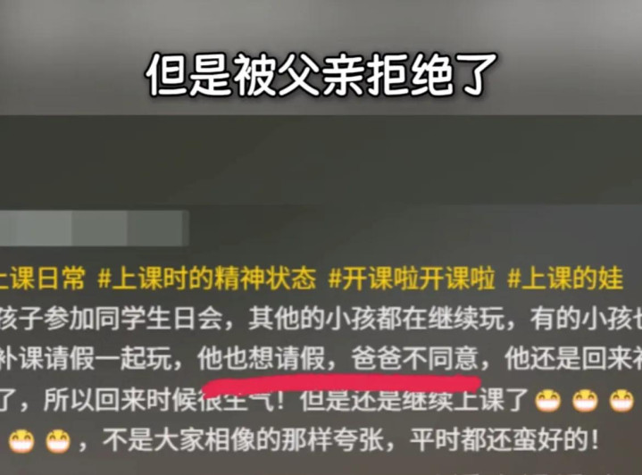 但看到母亲说,小男孩搭理了去干与同学的诞辰约聚,而况照旧去到了现场,效果他正在和同学们玩得欢乐的期间,却被父亲叫回顾上补习课。