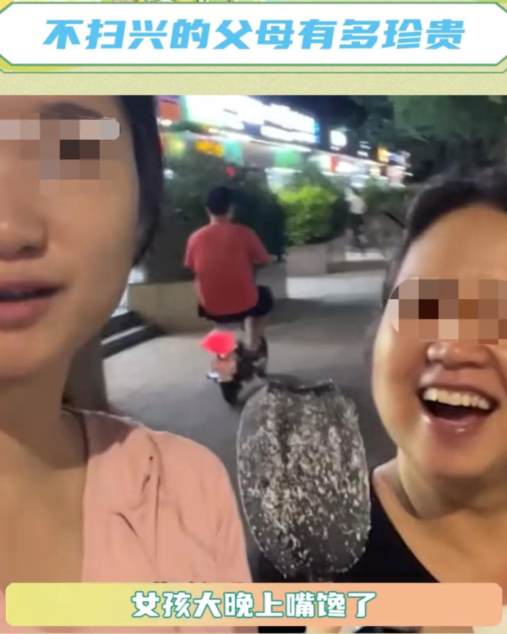 视频中,女孩大晚上念念吃夜宵了,姆妈莫得扫兴,而是和她全部到楼下来买东西吃。