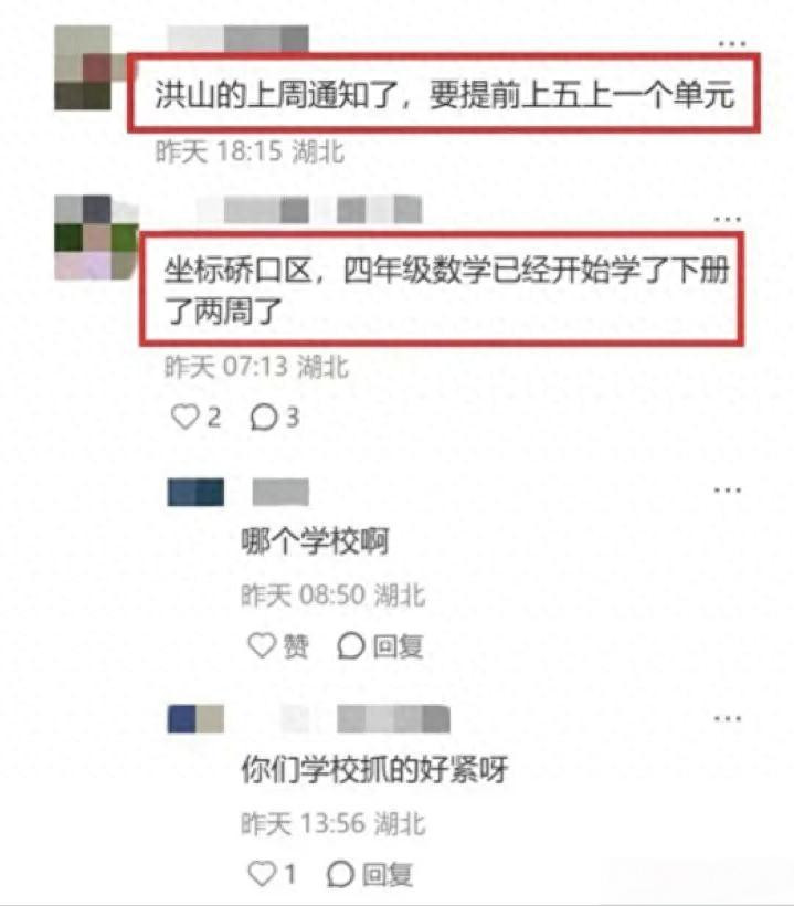 证明学生和家长的响应,采选提前教放学期践诺的学校不在少数,比如:硚口区有学生示意,照旧学习四年龄下册数学两周了;洪山区有家长称,上周见告要提前上五下等一单位;江汉区有学生示意,照旧在高放学期课程了;汉阳区有学生说,诚然学校暂时莫得书面见告,然则安分照旧理论见告了(东西湖区亦然访佛情况);光谷有家长说还莫得收到见告,但也有家长说,安分照旧见告了要打印放学期数学的一、二单位……